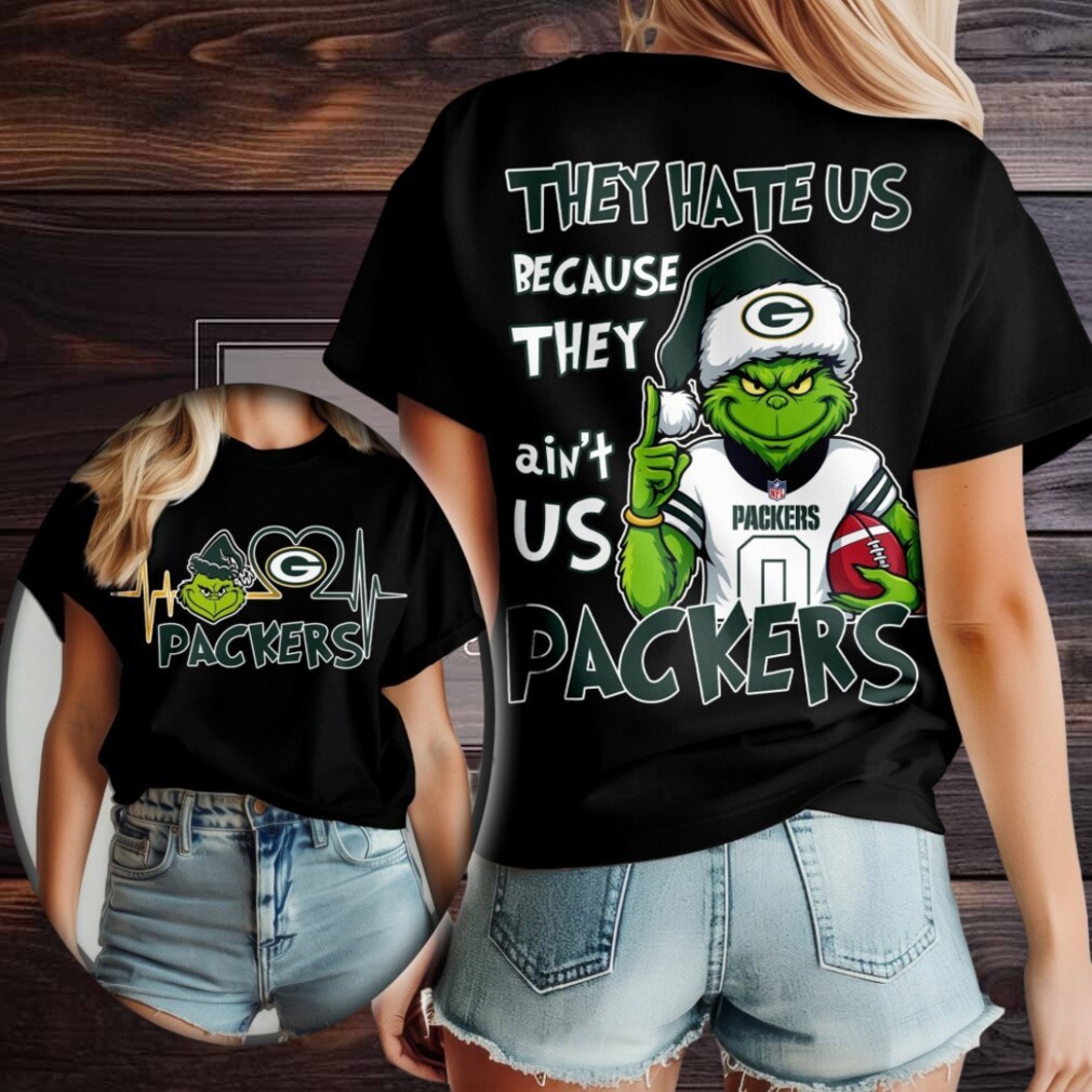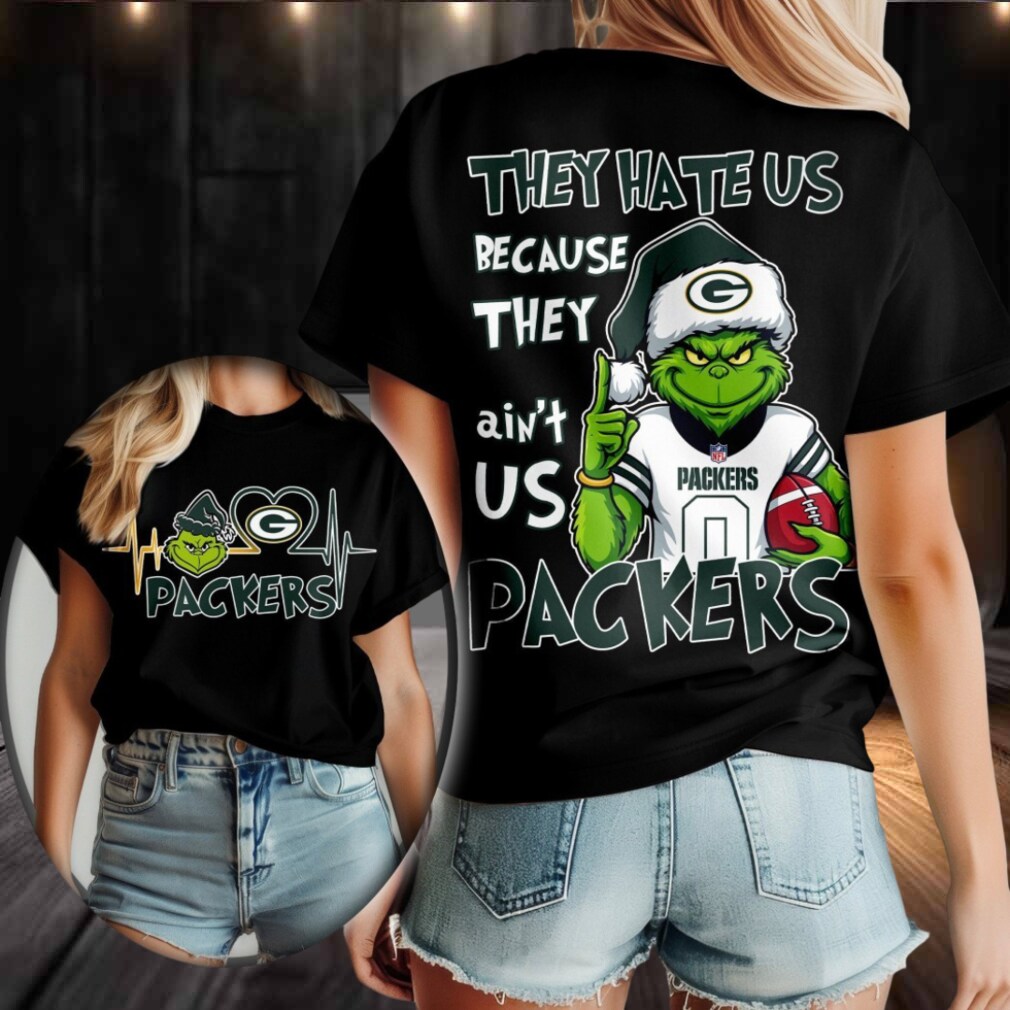 This holiday season, let the Grinch and Santa unite for the Green Bay Packers! This unique t-shirt mashes up the Whoville Grump with jolly Saint Nick, declaring “They Hate Us Because They Ain’t Us” in true Packers style. It’s the perfect way to spread some Christmas jeer (and cheer) while showing your unwavering support for the Green and Gold.
