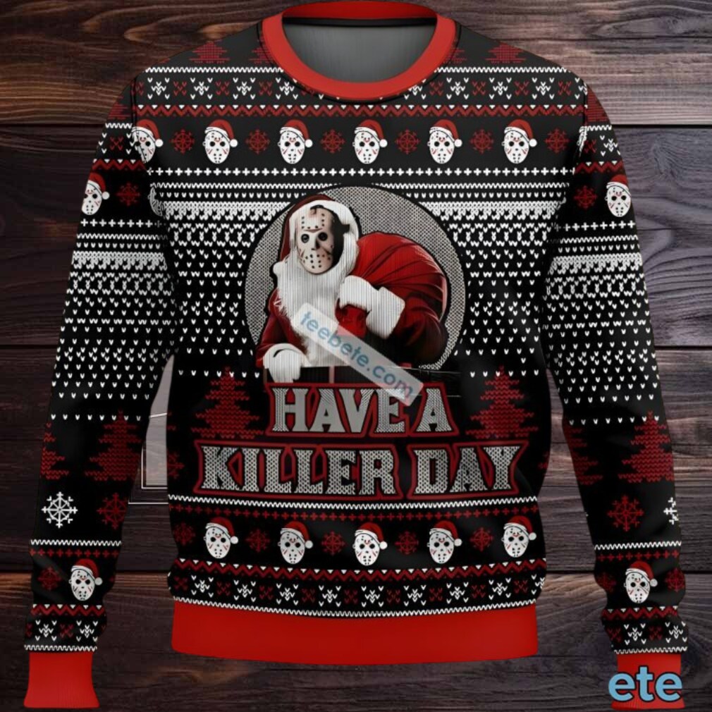 Want to “slay” the holidays? This “Have A Killer Day” Jason Voorhees Ugly Christmas Sweater is perfect for horror fans with a sense of humor. Imagine showing up to your next Christmas party in this black and red masterpiece – you’ll be the talk (and terror) of the town!