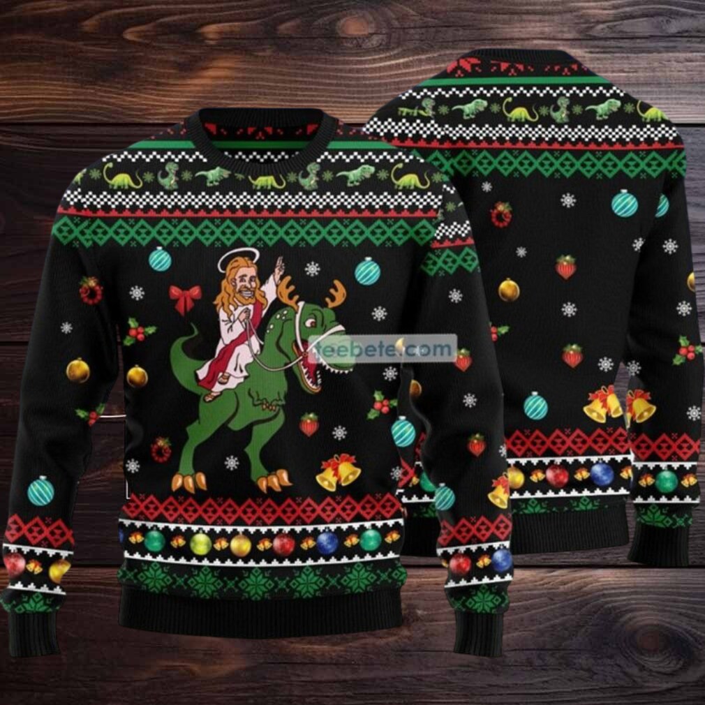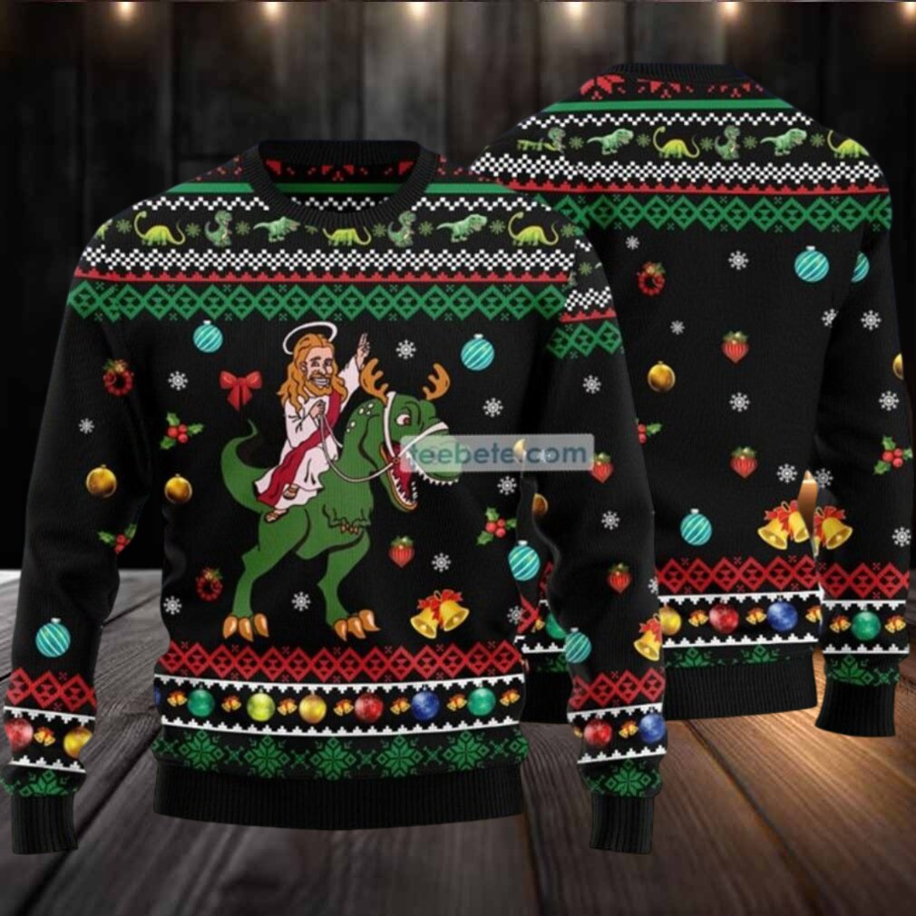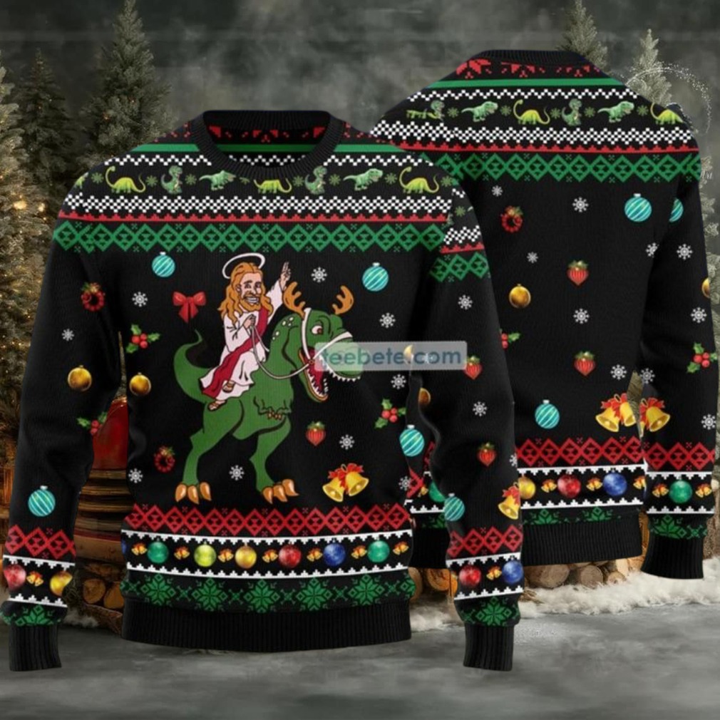 The Jesus Riding T Rex Dinosaur Ugly Christmas Sweater Family takes the traditional ugly sweater and catapults it into a realm of legendary fun. Imagine wearing this to your next holiday party.