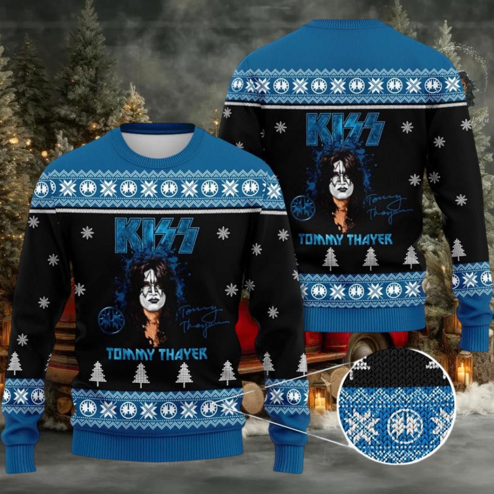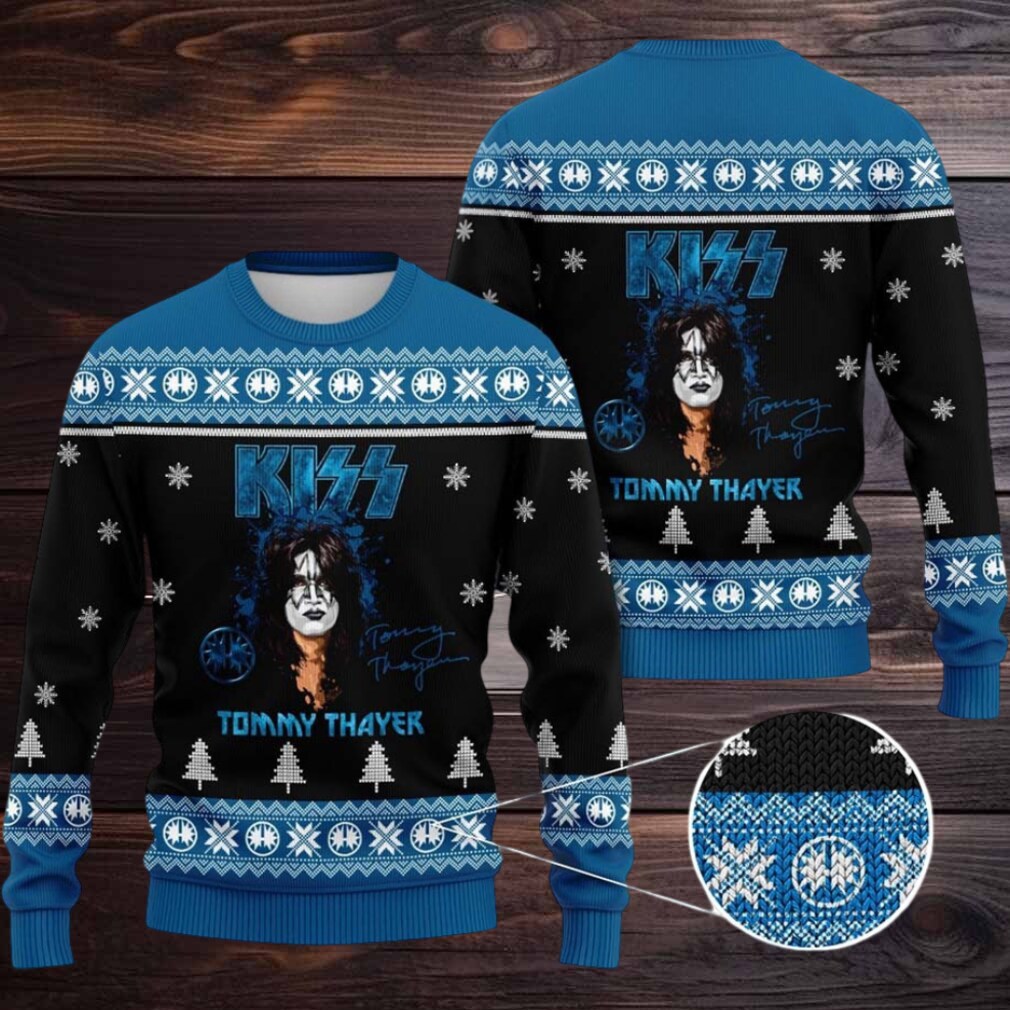 Rock your holiday with this Kiss Tommy Thayer Ugly Christmas Sweater! Featuring Tommy Thayer with his signature style, this blue holiday sweater is a perfect gift for Kiss fans. Spread some festive cheer with your favorite guitarist!
