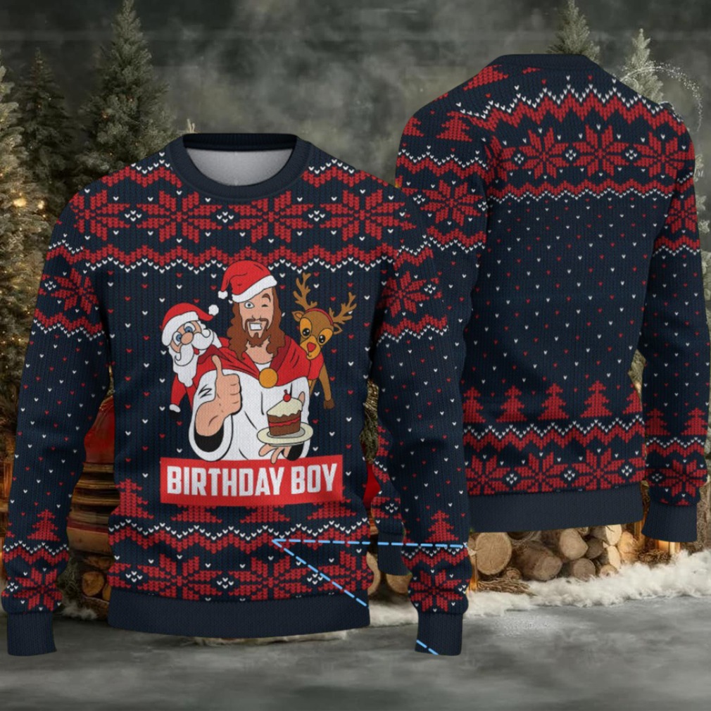 Celebrate the reason for the season with a touch of humor! This Navy Blue and Red Fair Isle “Birthday Boy Jesus” Ugly Christmas Sweater is a festive and funny way to show your Christmas spirit. This isn’t just an ugly sweater, it’s a celebration of the original birthday boy. Perfect for Christmas mass, family gatherings, or white elephant gift exchanges, this sweater blends faith and fun in a unique way.