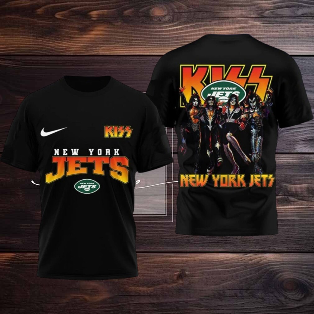 Imagine rocking this tee at the stadium, where the Jets take the field and the rock ‘n’ roll spirit takes over the stands. The design combines the iconic KISS band makeup with the New York Jets logo in a spectacular display of allegiance. Whether you’re belting out Shouth at the Devil or cheering on your team during a crucial play, this shirt will make you the envy of every fan.