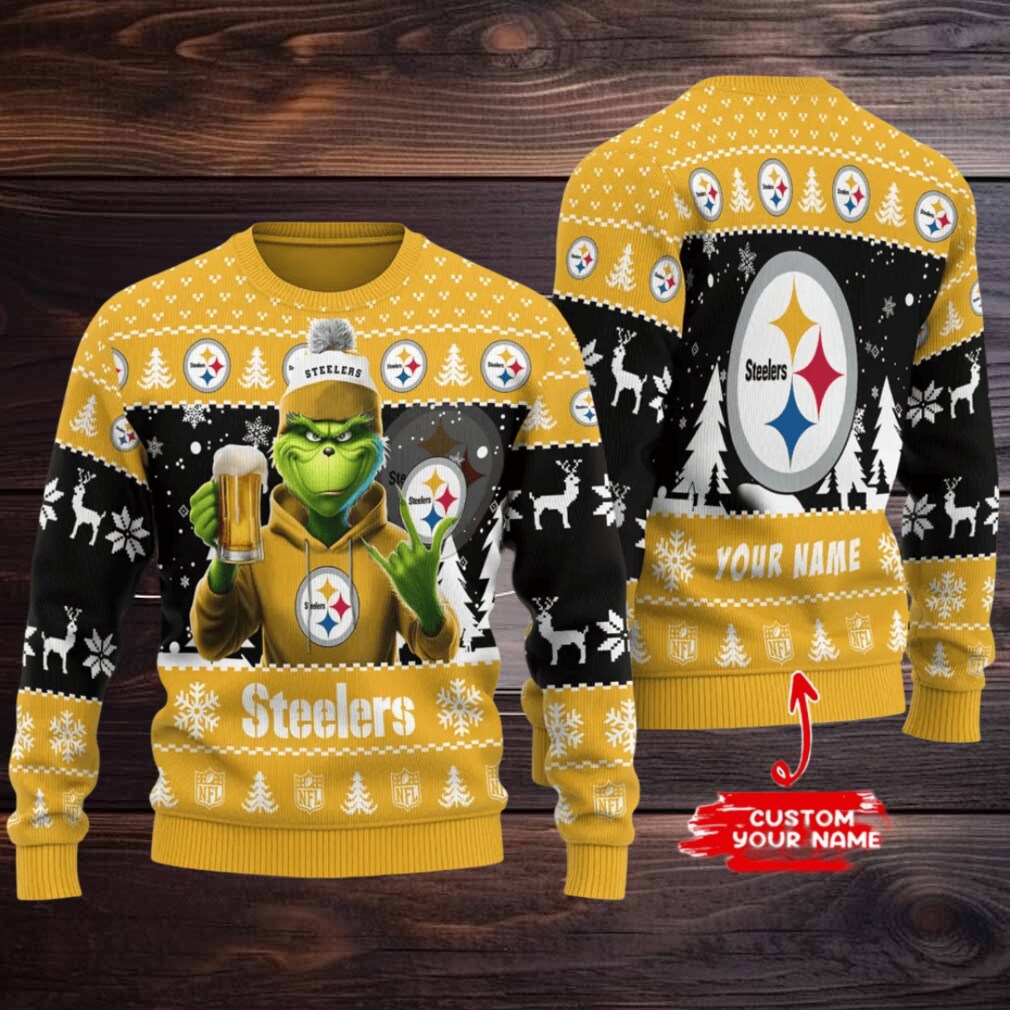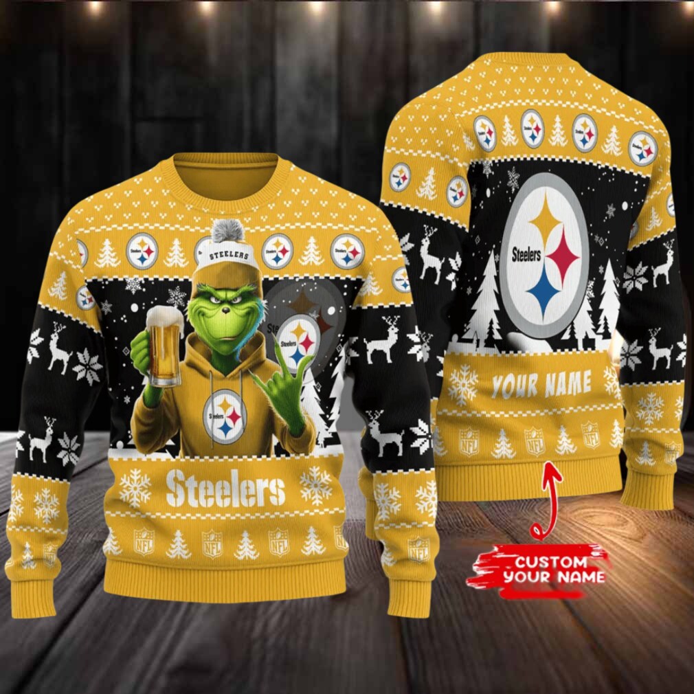 This isn’t your grandma’s Christmas sweater! This unique “ugly” sweater features a fun and festive Pittsburgh Steelers-themed design that’s sure to turn heads. Made from a comfortable and warm blend of materials, this sweater is perfect for staying cozy while showing off your team loyalty. Available in a variety of sizes, it’s the perfect addition to any Steelers fan’s wardrobe.