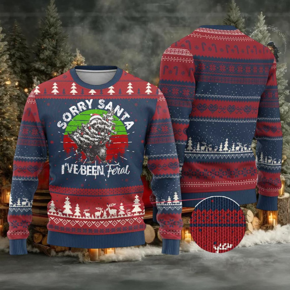 Unleash your inner wild child this holiday season with the “Raccoon Xmas Ugly Christmas Sweater”! This hilarious sweater features a mischievous raccoon and bold statement “Sorry Santa I’ve Been Feral Retro Xmas Tree”. Perfect for those who embrace a bit of chaos and want to stand out in a sea of traditional Christmas attire.
