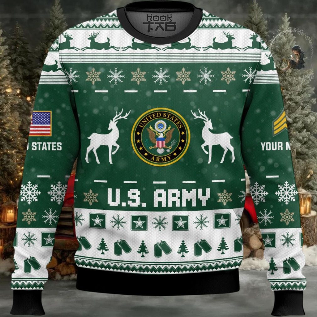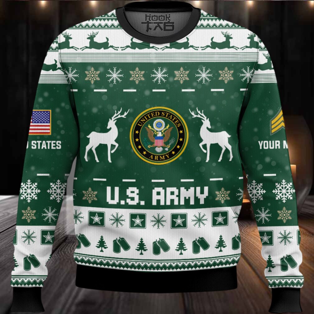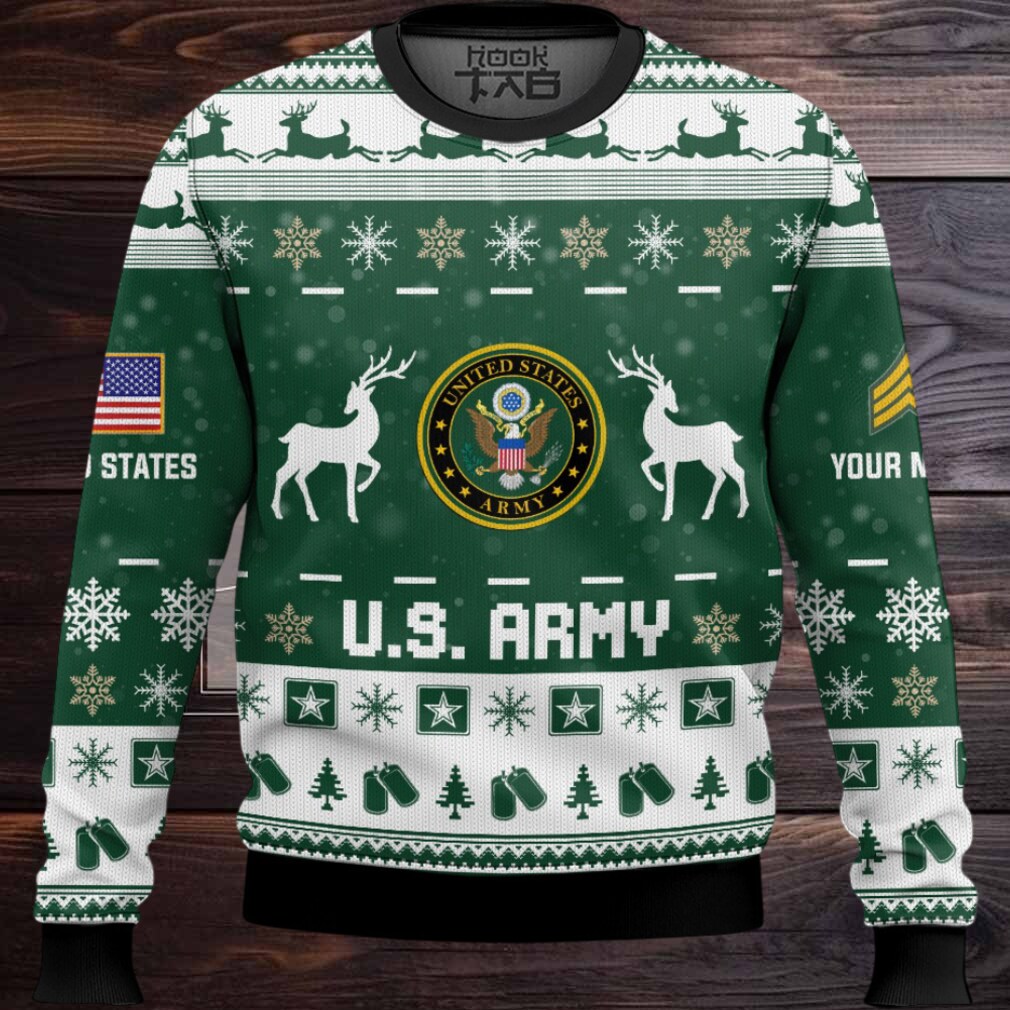 Solve the challenge of finding a Christmas gift that is both meaningful and supportive. This sweater identifies them as a proud member or supporter of the Army community and carries the important message of remembering our deployed troops. The customizable name and rank add a personal touch, making it a truly unique and memorable gift.